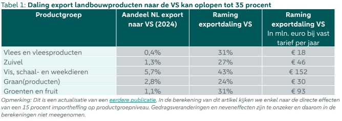 De Nederlandse landbouwexport naar de VS daalt tot 35% door de invoering van de importheffing van 15% op alle landbouwproducten, raamt ABN Amro in het rapport. De totale landbouwexport daalt hierdoor met 0,5%. Verder zet Brussel volgens de bank Europese waarden rond duurzame landbouw en voedselveiligheid en quota's in als wisselgeld. "Dit vergroot concurrentie en aanbod op de Europese markt van