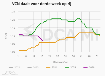 Wederom volgt de index niet de Nederlandse slachtnotering, maar de Belgische Deinze-notering, aangezien prijzen bij onze zuiderburen boven het Nederlandse niveau liggen. De prijs in dat land kwam in week 16 uit op €1,14 per kilo, tegenover €1,17 per kilo de week ervoor.