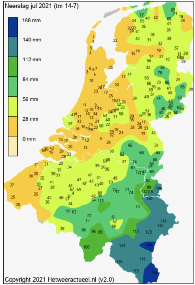 In de afgelopen 24 uur is in het zuiden van Limburg meer dan 100mm regen gevallen. Zoals het er nu uitziet blijven de zwaar getroffen gebieden de komende uren gespaard voor hevige regenbuien. Code geel geldt nu dan ook voor bijna geheel Nederland. Alleen Noord-Holland, Zuid-Holland en Zeeland vallen er net buiten. Het kan er elders in het land dan ook hevig aan toe gaan, maar zo erg als dat het in Limburg is gaat het niet worden.