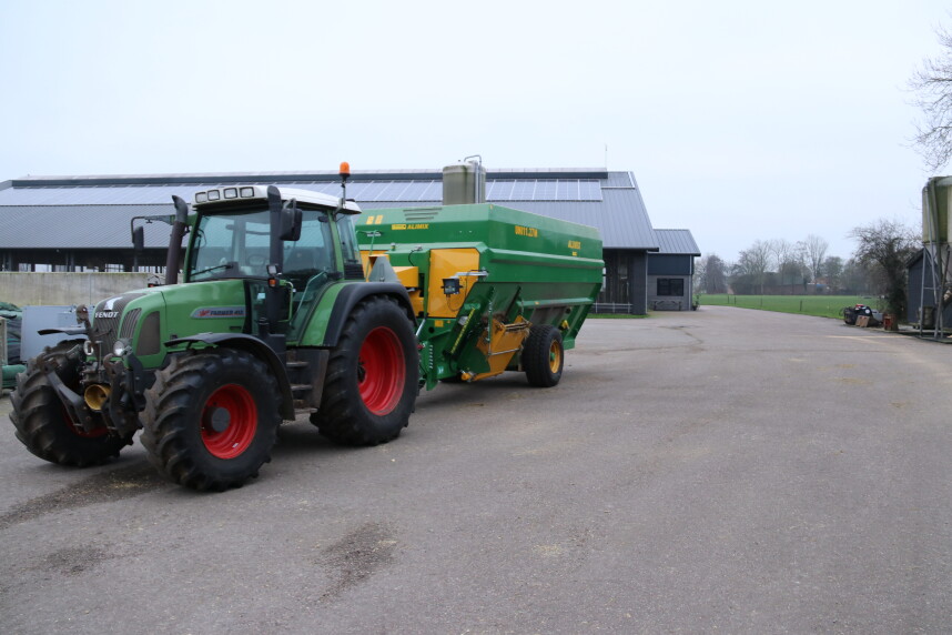 Op het bedrijf wordt het voer intensief gemengd met de recent aangeschafte Alimix mengwagen. Alle groepen vee worden gemengd gevoerd.