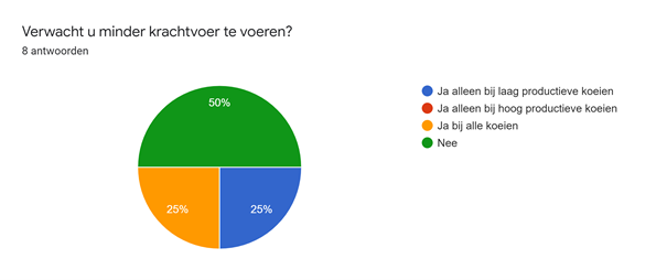 Wat betreft de kunstmest en krachtvoer is hier ook een kleine verschuiving. Ondanks de grote prijsstijging heeft voor de eerst snede alleen Hans Schoenmakers (NBr) minder kunstmest gestrooid. Bij Schoenmakers is er 32 kuub drijfmest samen met 8 kuub mineralen concentraat bemest per hectare. De mineralenconcentraat is bewerkte dunne fractie varkensmest, die als proef aangevoerd is als kunstmest. De drijfmest en mineralenconcentraat is als een homogeen product bemest. Hierdoor is er bespaard op kunstmest. Bij latere snedes is de verwachting bij de helft van de deelnemers dat er minder kunstmest gaat worden gestrooid. Hieronder in de diagram de verwachting van het krachtvoer vooruitzicht bij de deelnemers.