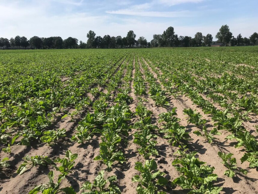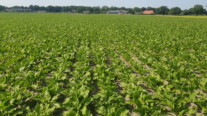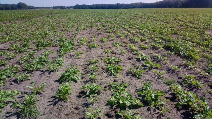 Bert Wissels uit Hengelo (GD) heeft ook een stukje van areaal ingevuld met voederbieten. Wissels geeft aan een wisselende opkomst te hebben. Na de regenval zijn alle zaadjes gekiemd en alsnog opgekomen. Robert Welhuis uit Wapse (Dr.) teelt ook Rialto. Op dit moment vindt hij de stand van het gewas matig, het heeft toch last gehad van de droogte. Na het zaaien heeft Welhuis beregend. Doordat sommige rijen te ondiep zijn gezaaid, was de opkomst wisselend. Uiteindelijk is wel alles boven gekomen, maar is een onregelmatige stand het gevolg. Gelukkig zijn er ook delen van het perceel die wel mooie gewassen weergeven. Welhuis is wel tevreden over de groei van afgelopen week. Hij vertelt dat de opbrengst nog niet te voorspellen is, want de voederbieten kunnen enorm bijtrekken. Op dit moment is heeft Welhuis vijf keer de bieten gespoten om het gewas gezond te houden.