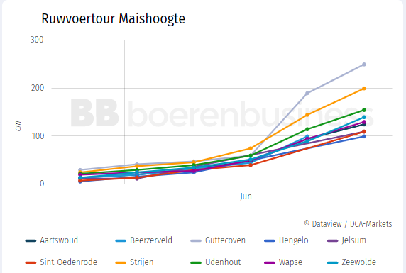 De maïs ontwikkelt zich erg goed. De hoge temperaturen met de nodige neerslag creëren op sommigen momenten een bijna tropisch klimaat, waar maïs over het algemeen goed op reageert. In een grafiek is weergegeven hoe explosief de laatste weken de maïs in hoogte is gegroeid.