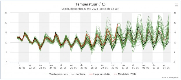 In de grafiek hierboven is goed te zien dat na het dipje rond Pinksteren, de temperaturen mooi gaan oplopen. Met name de maïs verlangt naar deze temperatuurstijging en het geeft de kans voor het grasland om op te drogen na alle regenval van de afgelopen weken. Ook biedt het de mogelijkheid aan de melkveehouders om te maaien waar de eerste snede nog op het land staat.