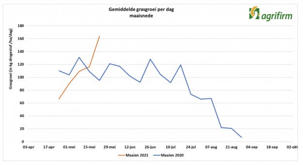 De gemiddelde grasgroei ligt met 160 kilo droge stof per dag aanzienlijk hoger dan vorig jaar. Waar vorig jaar de droogte de groei remde, is daar dit jaar geen sprake van.