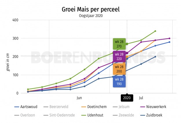 Hoewel de snijmaïs een goede groeispurt heeft gekend, trekt het de achterstand in vergelijking tot vorig jaar niet recht. De 2 meter is bereikt en overschreden, maar vorig jaar zagen we rond deze tijd al planten die de 3 meter bijna aantikte. Zo bereikte de maïs van de Brabantse melkveehouder Hans Schoenmakers rond dezelfde periode vorig jaar een hoogte van 2.70 meter.