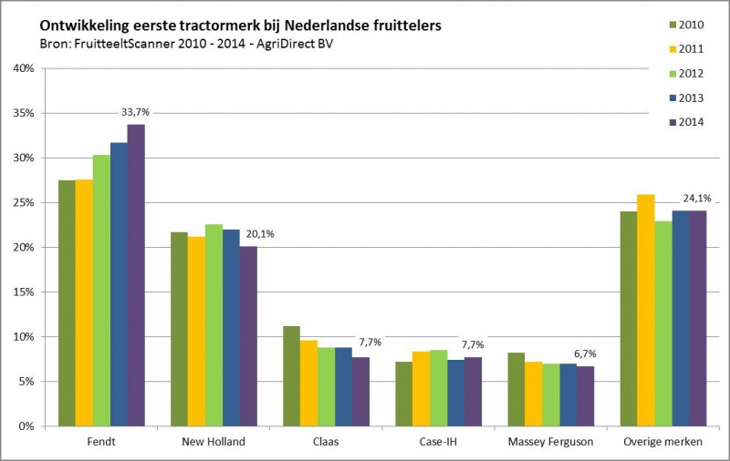Agridirect hield hun telefonische enquête onder 850 Nederlandse fruittelers. Hieruit is gebleken dat 33,7 procent als eerste trekker een Fendt op hun bedrijf gebruikt. Een stijging van bijna 2 procent ten opzichte van vorig jaar. New Holland eindigt op plek twee, met ruim 20 procent. Claas staat, flink lager, op drie met 7,7 procent. Ook Case IH bevindt zich op dat niveau. In de laatste jaren heeft alleen Claas zich iets opgewerkt.