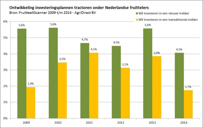 Ondertussen staan de investeringsplannen van fruittelers wederom op een laag pitje. Vorig jaar was ruim 5 procent nog van plan een nieuwe trekker aan te schaffen. Die duikt dit jaar terug naar 4 procent. 1,7 procent zegt te gaan investeren in een gebruikte trekker. Voor zowel nieuwe als gebruikte smalspoortractoren gaat het hier om de laagste cijfers sinds 2009.