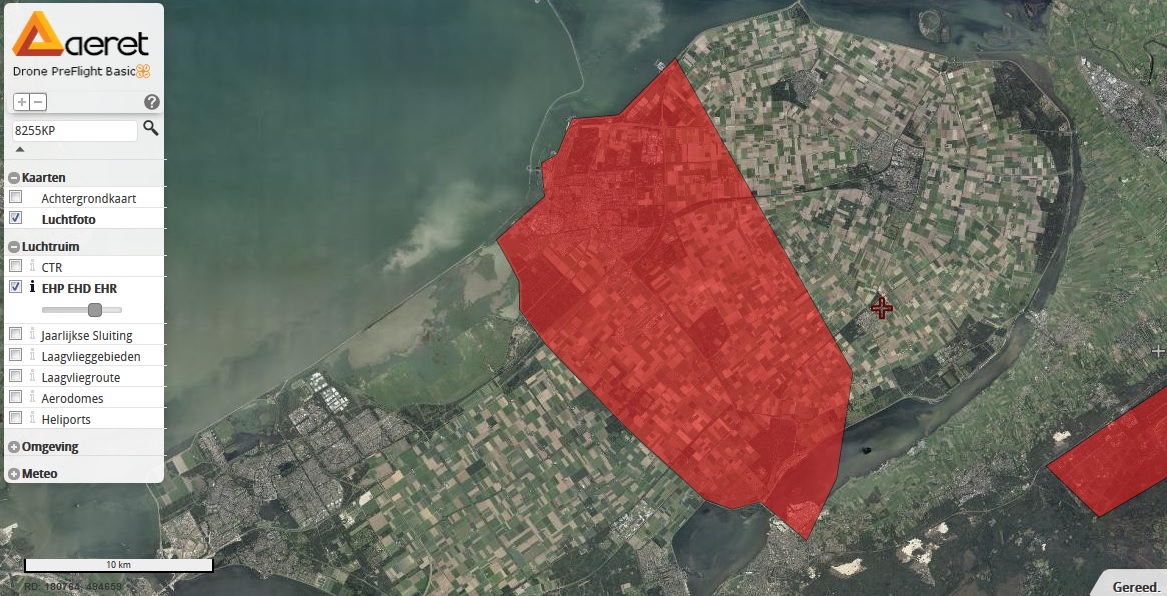De gratis versie; Drone Preflight Basic geeft je direct veel informatie over het luchtruim. Rond vliegveld Lelystad vind je een flink gebied waar je met een drone niet mag vliegen.