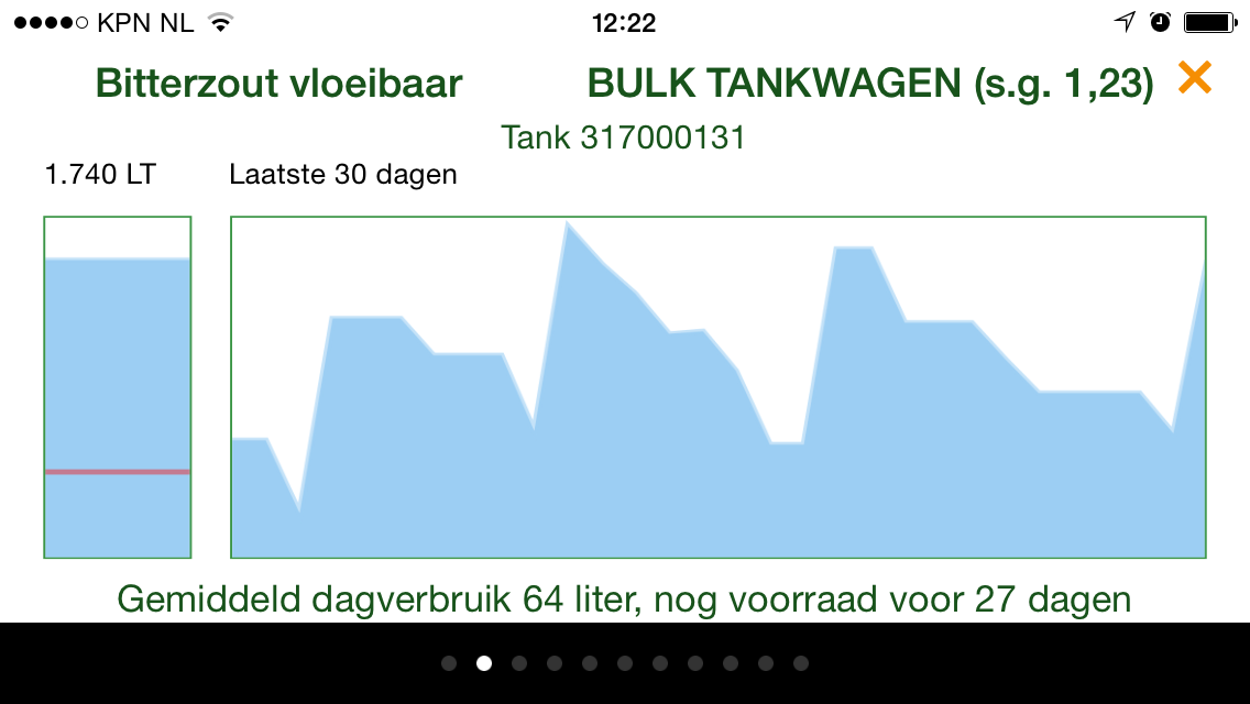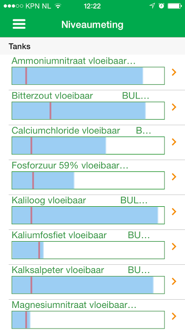 In de app zie je overzichtelijk de voorraad van alle kunstmesttanks. Ook kun je het punt aangeven wanneer nieuwe voorraad moet worden besteld.