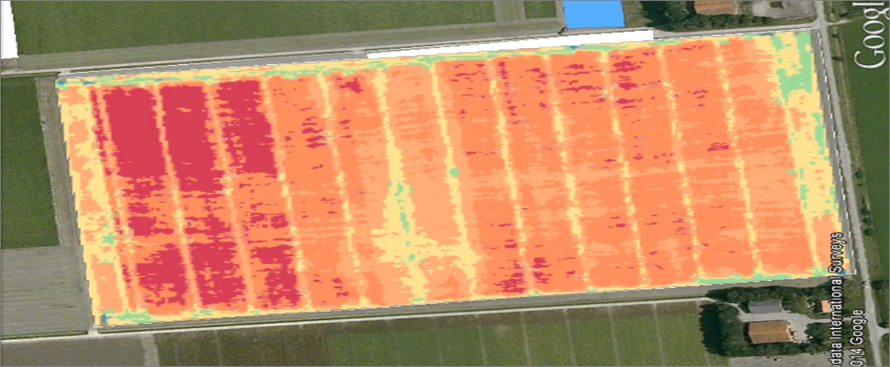 Spectraalbeeld vanuit het vliegtuig van het aardappelperceel op 23 juni 2014 in Dronten. De mindere plekken in het midden en rechts op de foto bleken bij nadere beschouwing niet te zijn ontstaan door stikstofgebrek, maar hadden een andere oorzaak.