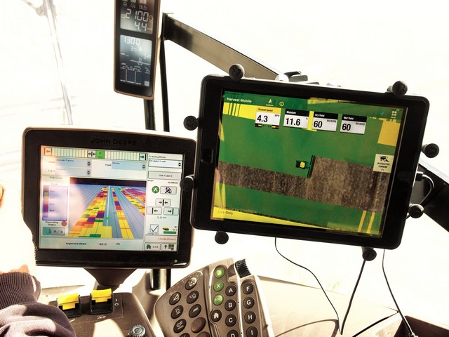 Naast de standaard terminal kun je vanaf dit najaar in de John Deere combine cabine ook een iPad hangen met daarop hun Harvest Mobile app. Die geeft tips hoe de machine prestaties kunnen worden verbeterd.