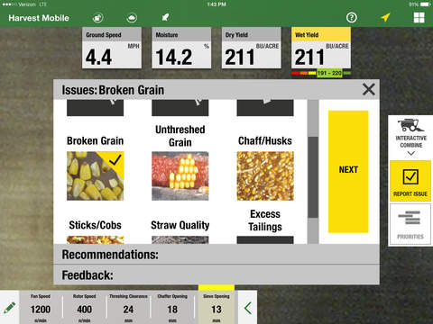 Het aanbieden van verbeteringen kende Deere al in de standaard terminals op T, W en S combines. Je kiest uit een lijst met vragen, bijvoorbeeld ik heb teveel verlies over mijn schudders, en je krijgt een mogelijke oorzaak. De app gaat een stapje verder en werkt via een gelijk systeem als Cemos van Claas. Die draait echter op een terminal. Het systeem van Deere heet Interactive Combine Adjustment.
