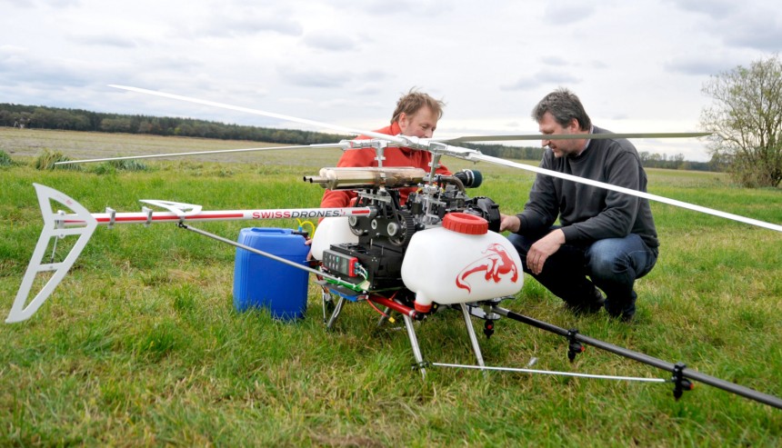 In 2011 startte DLR Mosel met het project. De totale kosten die daarmee gemoeid zijn bedragen 760.000 euro. Deze worden door de overheid gedekt. Voor het spuiten wordt een flinke drone gebruikt met benzine motor. Deze heeft twee kleine middelentankjes en een spuitboom. Yamaha maakt momenteel als enige fabrikant op grote schaal drones die worden ingezet voor de gewasbescherming. Deze worden vooral voor de rijstteelt ingezet.