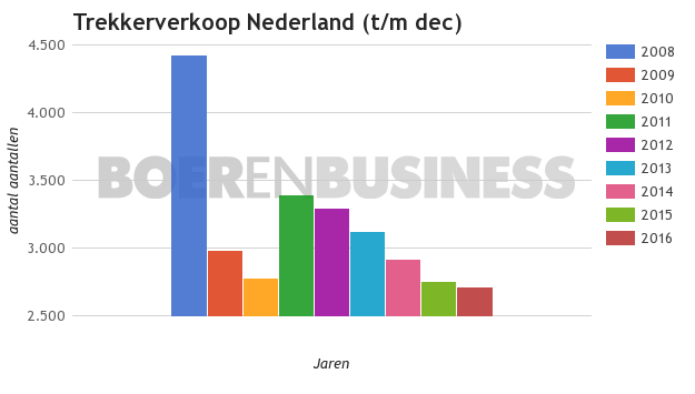 De verkoop gedurende twaalf maanden in 2016 was goed voor 2.711 nieuwe landbouwtrekkers. Daarnaast verkochten dealers in totaal ruim 600 compacttrekkers. Met een eindresultaat van goed 2.700 stuks komt afgelopen jaar nog iets lager uit dan 2015. Het verschil is met 42 stuks echter zeer klein. Na de topjaren 2008 en 2011 zit de verkoop alsmaar in een dalende lijn. Het is maar de vraag of 2017 hier verandering in gaat brengen.
