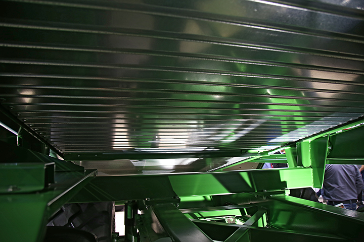 "Met overladen zijn er 2 principes mogelijk. Via de achterzijde of met een zijelevator", legt een medewerker van Hawe uit. "Lossen via een elevator heeft de voorkeur, omdat je als chauffeur het proces dan goed kunt volgen. Zeker bij aardappelen is dat een vereiste. Bij een achterlosser moet je uitstappen en erbij staan. Met een zijlosser lever je in op capaciteit. In de praktijk blijkt 120 ton echter voldoende. Het laadvolume moet misschien nog hoger. De bunker heeft nu een bodem met stalen lamellen. Voor tafelaardappelen levert dat beschadiging op. Daarom kunnen we ook een kunststofbodem monteren. Er is bewust niet voor een kiepende bunker gekozen, omdat de productstroom dan moeilijker is te reguleren."