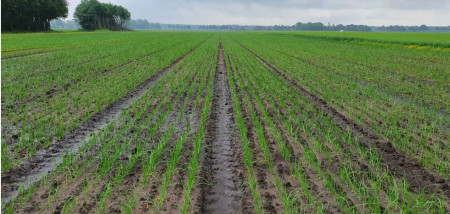 Door de warme dagen aan het einde van mei en begin van juni zit de groei op de uienpercelen er goed in. De percelen kleuren steeds groener. Op het perceel in Zeewolde viel in korte tijd echter veel regen, waardoor er plassen op het land ontstonden.