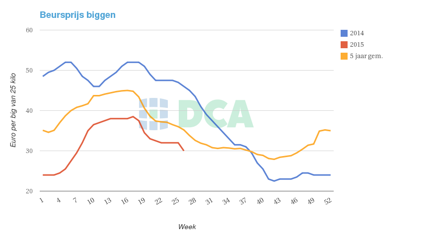 De biggenprijs bleef in week 25 nog stabiel in afwachting van de varkensmarkt, maar ook in die week zag het er al naar uit dat de biggenmarkt een nieuwe periode met verlagingen tegemoet ging. De varkensmarkt verslechterde onverwachts snel en dit zorgde voor druk op de biggenmarkt. Om niet vooruit te lopen op de ontwikkeling van de varkensprijs wist de beursprijs biggen zich nog net te handhaven.