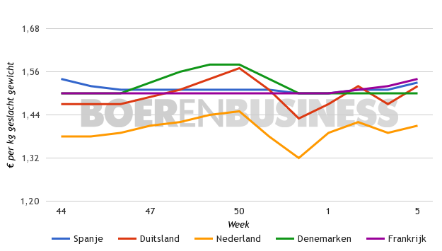 Over week 5 plust de Duitse varkensprijs met 5 cent tot 1,51 euro per kilo. Echter, gezien het feit dat de Duitse slachterijen niet meebewegen is het nog maar de vraag of de verhoging woensdagmiddag stand kan houden. De dalende beweging die de internetbeurs dinsdag maakte, bevestigt deze gedachte. Andere noteringen in Europa maken in week 5 een gematigde koersbeweging. In België en Nederland plust de prijs met circa 2 cent tot 1,42 en 1,40 euro, terwijl de Franse varkensprijs met één cent plust tot 1,53 euro. Opvallend is wel dat de Spaanse varkensprijs, na weken van stabilisatie, ineens 3 cent hoger noteert op 1,53 euro.