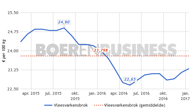 Over februari stijgt de prijs van vleesvarkensbrok met 15 cent tot 23,30 euro per 100 kilo. Dit is het hoogste niveau sinds februari vorig jaar. De prijs van start/overgangskorrel kent een zelfde prijsverhoging en noteert 27,25 euro. Zeugenbrok dracht en lakto plussen beide met 0,20 euro tot 22,85 en 22,65 euro per kilo. Babybiggenkorel is met 10 cent naar boven toe bijgesteld en kostte afgelopen maand gemiddeld 34,30 euro per 100 kilo.