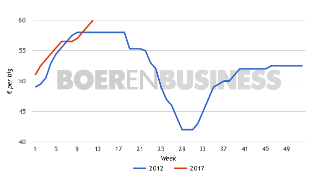 De koersbeweging op de Duitse biggenprijs gaat deze weken overigens redelijk gelijk op met de winterperiode 2011/2012. Toen bereikte de NordWest-notering uiteindelijk het vorige record van 58 euro (zie grafiek). Ook toen begon de notering vanaf het vierde kwartaal te groeien en bereikte de koers in de maanden maart en april uiteindelijk de top.