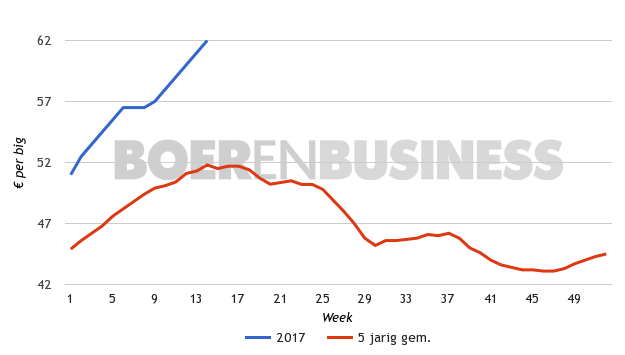 De biggenprijs noteert in Europa gemiddeld 57,30 euro per big, week 13. Dat is meer dan 43 procent boven het gemiddelde dat vorig jaar in die week op de borden stond. Ten opzichte van het langjarig gemiddelde ligt de prijs in 2017 bijna 20 procent voor op de andere jaren.