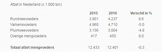 De mengvoerafzetcijfers over 2016 laten weinig verassingen zien. Tussen de sectoren tekenen zich behoorlijke verschillen af, maar per saldo bleef het volume nagenoeg gelijk. De totale afzet daalde met 0,3 procent tot 12,4 miljoen ton. Dit blijkt uit cijfers van Nevedi.