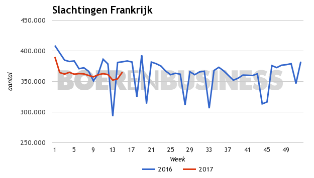 Franse slachterijen verwerkten 365.402 varkens. Dat is een plus van 3 procent ten opzichte van de voorgaande week. Desondanks blijft het slachtcijfer ver onder het niveau van 2016. Het procentuele verschil, met dezelfde week vorig jaar, bedraagt namelijk 4,3 procent. Dit zijn ruim 16.000 varkens in exacte aantallen. Dat Franse media spreken over extreme krapte, is daarom niet vreemd.