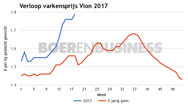 In navolging van de Duitse varkensprijs en de DCA Beursprijs 2.0 plust de varkensprijs van Vion ook met 3 cent tot 1,79 euro. Volgens Vion zijn de oplopende varkensprijzen minder makkelijk door te voeren op de vleesmarkt dan voor Pasen het geval was. Buiten Europa zorgt, beduidend lager geprijsd Amerikaans varkensvlees, voor prijsdruk. Toch gaat Vion mee omhoog.
