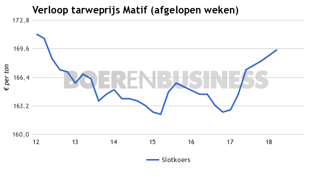 De tarweprijs op de Matif heeft echter de stijgende lijn weer opgepakt. Dit is het gevolg van droogte in de Franse graangebieden. Hierdoor zet de Matif dinsdag, 2 mei, in op aanzienlijk hogere prijzen tot boven de 170 euro per ton. In Amerika heeft tarwe juist te kampen met een overschot aan water, wat eveneens prijsopdrijvend werkt.