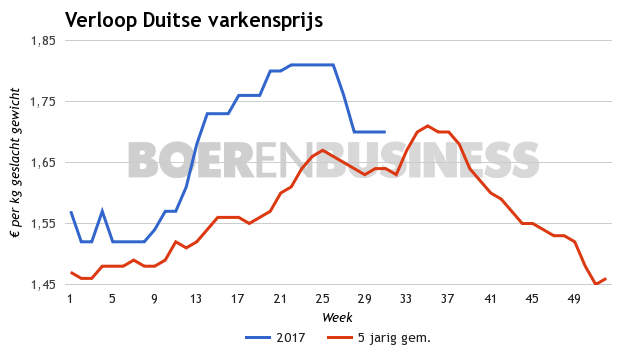 Het verloop van de Duitse varkensprijs in 2017 en het 5-jarig gemiddelde.