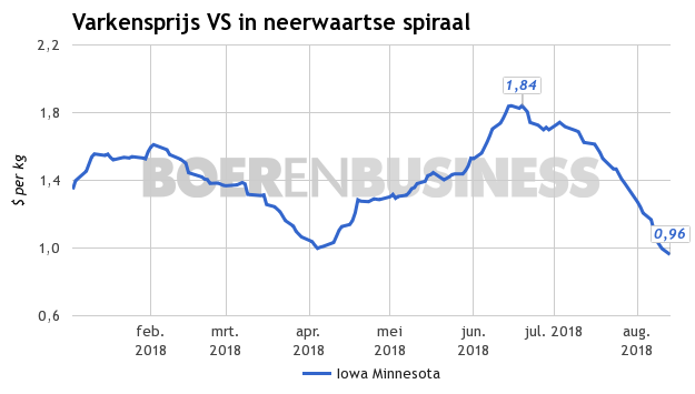 In de VS zakt de varkensprijs af naar historisch lage niveaus. De Iowa/Minnesota-notering noteert actueel (13 augustus) $0,96 per kilo, terwijl 2 maanden geleden nog boven de $1,80 per kilo werd genoteerd. Niet eerder stond de prijs, in deze tijd van het jaar, op dergelijk lage niveaus.