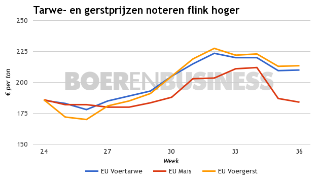 De stijgingen liggen in het verlengde van ontwikkelingen op de grondstoffenmarkt. Door de droogte in diverse graanproductieregio’s zijn die gebieden flink opgeschud. Zo noteren de prijzen van voertarwe en -gerst (EU-Rotterdam) boven de €210 per ton. De tarweprijs op de Matif in Parijs noteerde recent ook boven dit niveau, maar is ondertussen weer wat afgezakt.