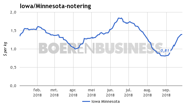 De Amerikaanse varkensprijs is sinds eind augustus bezig aan een sterke opmars. Zo stond de Iowa/Minnesota-notering eind augustus nog op een niveau van $0,81 per kilo (sinds 2005 stond deze niet meer zo laag). De prijs steeg sindsdien met $0,59 tot $1,40 per kilo.