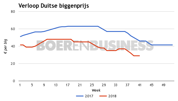 In Duitsland blijft de druk op de biggenprijs (de Nord/West-notering) van kracht. Hoewel de notering van afgelopen week (€29 per big) onveranderd is, wijst de trend van deze week op een verlaging (-€1). De reden hiervoor is dat het aanbod groter is dan de vraag.