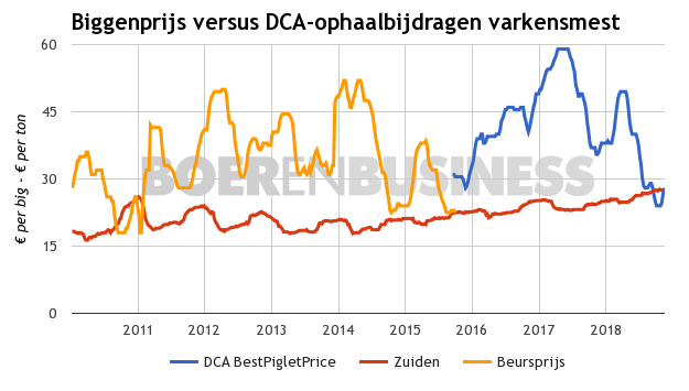 In de periode van april tot medio oktober leverde de BPP €25,50 in tot €24 per big, wat een diepterecord is. Deze prijsval, in combinatie met de stijgende ophaalbijdragen voor varkensmest, maakt dat de biggenprijs (exclusief toeslagen) sinds november onder de ophaalbijdragen uitkwam. Ten tijde van de Beursprijs biggen gebeurde dit alleen in het vierde kwartaal van 2010.