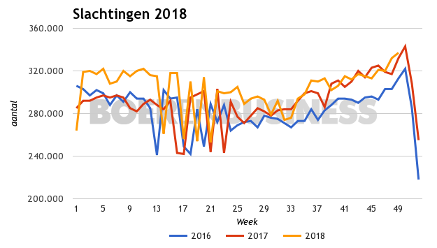 De hoge slachtcijfers corresponderen met de geluiden uit de markt, die zeggen dat de slachterijen op volle toeren draaien. Ook deze week is dat nog het geval; doorgaans piekt het slachtcijfer in week 50, waardoor een nieuw slachtrecord binnen handbereik is. Deze staat nu op 343.000 varkens (week 50, 2017).