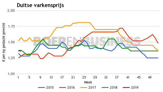 De Internetbeurs is na een onderbreking van enkele weken weer in de lucht en de eerste notering van 2019 was niet verrassend. De graadmeter op de markt daalt met €0,01 tot €1,39 per kilo en staat daarmee nog ruim boven de Duitse varkensprijs (de VEZG-notering). Die bleef stabiel op €1,36 per kilo. Dat slechts 6 van de 16 partijen werden verhandeld, geeft aan dat de vraag naar varkens ook in Duitsland nog moet loskomen.
