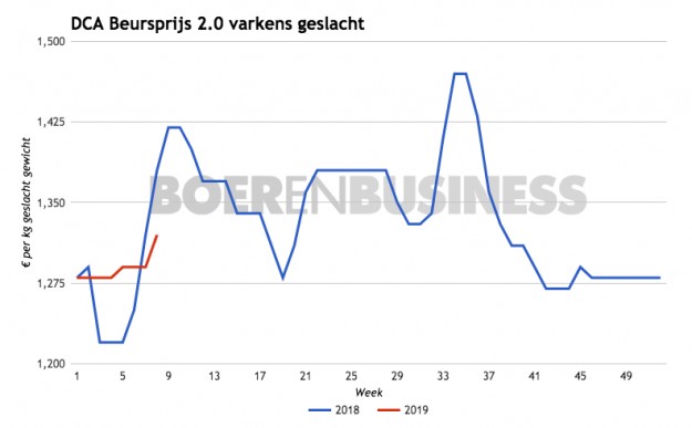 Tot ergernis van de (Duitse) vleesvarkenshouders werd de beweging niet gevolgd door de grote Duitse slachterijen; zij voerden een 'Hauspreise' in. Circa 1 week later moesten de slachters bakzeil halen en volgden zij de verhoging alsnog op. Daarom steeg de DCA Beursprijs met €0,03 tot €1,31 per kilo. In de weken hiervoor was de notering al met €0,01 gestegen, waardoor Nederland in het spoor blijft van Duitsland.