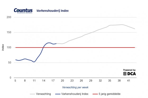 Door de afvlakkende varkensprijzen rond Pasen maakt de Index nu een pas op de plaats, maar de verwachting is dat de stijgende lijn snel kan worden hervat. Ondertussen stijgen de varkensprijzen weer en historisch gezien is het plafond nog niet bereikt. Bovendien is de verwachting dat de prijs van vleesvarkensbrok verder gaat dalen.