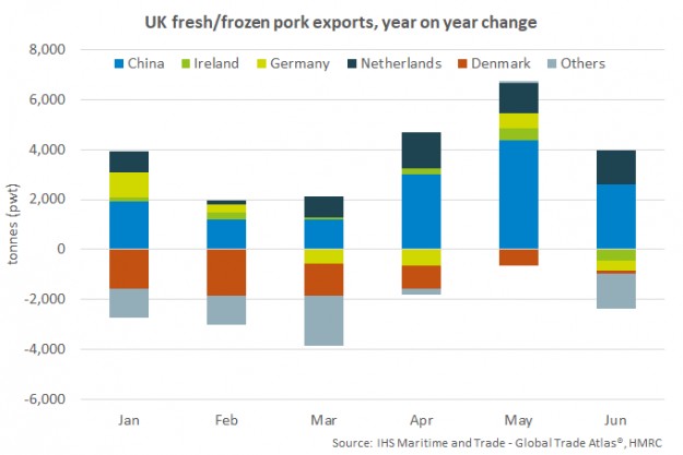 Over juni heeft het Verenigd Koninkrijk 18.400 ton varkensvlees (vers/bevroren) geëxporteerd. Dat is 10% meer dan dezelfde maand vorig jaar en tevens het hoogste exportniveau sinds juni 2016. De exportwaarde steeg daarbij met bijna 25% naar £28 miljoen (omgerekend €30 miljoen). De groei komt vooral de toegenomen export naar China. Dat land nam in deze periode (met 5.300 ton) bijna 2 keer zoveel af als vorig jaar.