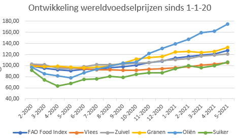 De wereldvoedselprijsindex van de FAO steeg met liefst 5,8 punten tot een niveau van 127,1. Het niveau ligt nu inmiddels 36,1 punten hoger dan een jaar geleden. Percentueel gezien betekent dat een stijging van de wereldvoedselprijzen met 39,7%. Bijna alle onderdelen in de index bevorderden de stijging. Zo werden onder ander oliën, suiker, granen, vlees en zuivel duurder in de maand mei. De FAO prijsindexen geven de hoogte van de voedselprijzen aan ten opzichte van de gemiddelde prijzen over de periode 2014-2016 (=100).
